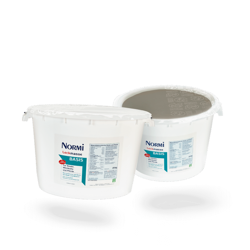 NORMI Leckmasse BASIS ist eine mineralische Leckmasse für Rinder, laktierende Kühe und Pferde zur täglichen Grundversorgung mit wichtigen Spurenelementen und Vitaminen. Sie ergänzt die Ration als mineralisches Ergänzungsfuttermittel und unterstützt eine stabile Mineralstoffversorgung im Stall und auf der Weide. Die ausgewogene Kombination aus süßen und salzigen Komponenten fördert eine gleichmäßige Aufnahme und ermöglicht es den Tieren, ihren individuellen Bedarf selbstständig zu decken.